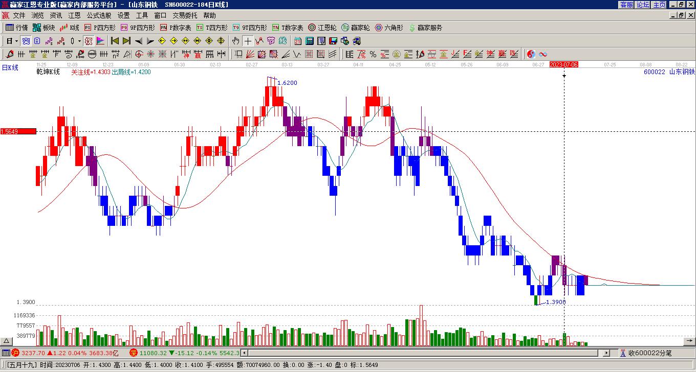 山東鋼鐵(600022)處于贏家江恩多頭中期回調形態(tài),今日重心持續(xù)下移,短期延續(xù)下跌趨勢,12月31日發(fā)出中期江恩筑底信號后,經過19日,今日形成中期筑頂信號,若持續(xù)下跌,觸發(fā)長期筑頂信號,山東鋼鐵(