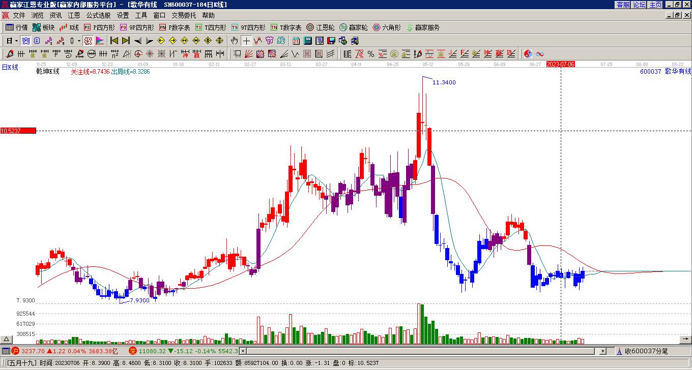 600037歌華有線根據(jù)贏家江恩極反通道趨勢(shì)工具展示,上方壓力位7.8727,下方支撐位6.9143。600037歌華有線處于贏家江恩多頭中期回調(diào)形態(tài),11月19日發(fā)出江恩筑頂信號(hào)后,經(jīng)過20日,今日