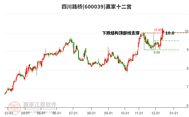四川路橋處于贏家江恩多頭次主線形態(tài),10月22日發(fā)出江恩筑底信號后,經(jīng)過69日,今日形成短期筑頂信號,短期多頭趨勢已被破壞,中期雖然處于回調(diào)中,但長期多頭趨勢延續(xù)。四川路橋根據(jù)贏家江恩極反通道趨勢工具