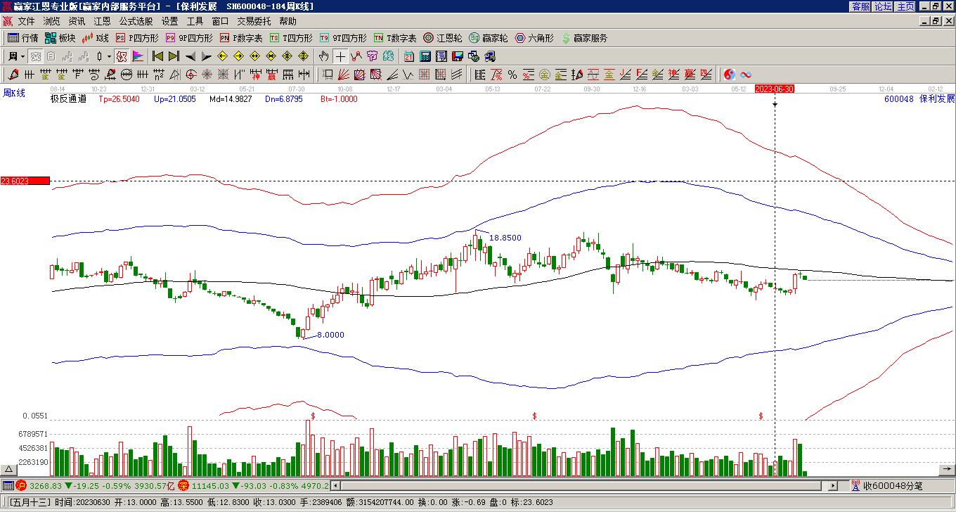 600048保利發(fā)展最高價(jià)挑戰(zhàn)藍(lán)色外軌線 漲幅4.56%