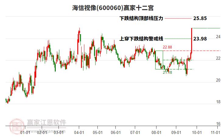 600060海信視像根據(jù)贏家江恩極反通道趨勢工具展示,上方壓力位25.0653,下方支撐位21.451。600060海信視像處于贏家江恩多頭次主線形態(tài),12月17日發(fā)出江恩筑底信號后,經過5日,今日形