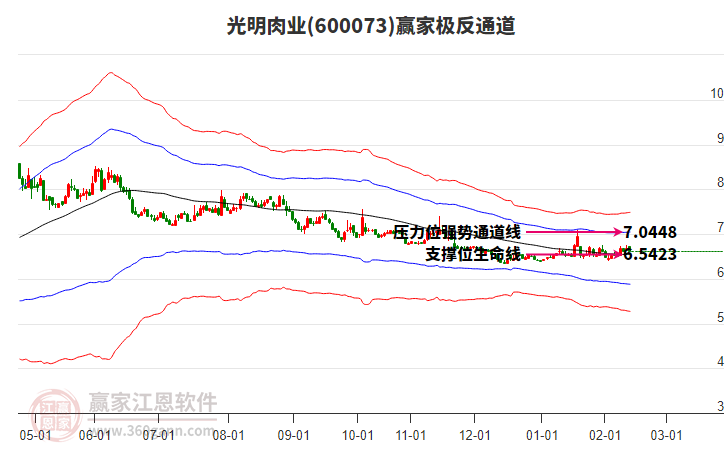 依據(jù)贏家江恩系統(tǒng)趨勢工具極反通道分析判斷光明肉業(yè)600073運行在生命線以下弱勢區(qū)域,根據(jù)規(guī)則該股短線輕倉參與,股價跌至弱勢外軌線后波段再結(jié)合其它工具信號建倉。應(yīng)用口訣是:生命線上強勢走,生命線下難抬頭;紅黃兩條外軌線,壓力支撐顯勢頭。
