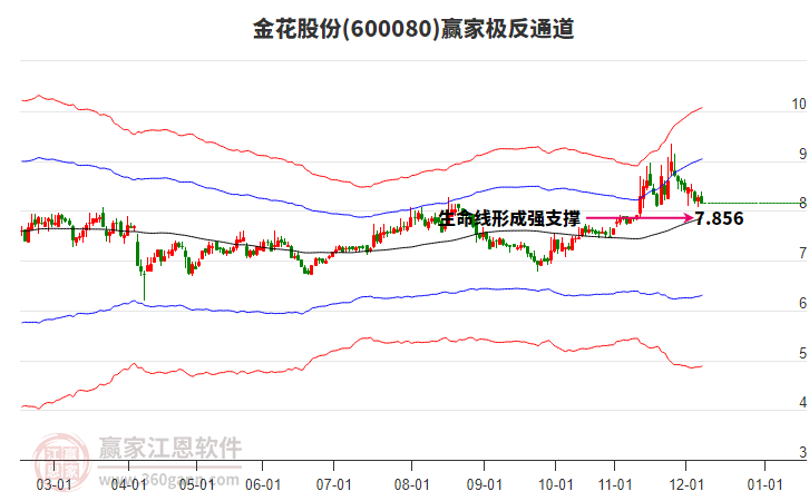 依據(jù)贏家江恩系統(tǒng)趨勢工具極反通道分析判斷金花股份600080運行在生命線以上強勢區(qū)域,根據(jù)規(guī)則該股可短線、波段結(jié)合操作;結(jié)合物極必反的原理通過分鐘圖做盤中差價,應用口訣是:生命線上強勢走,生命線下難抬頭;紅黃兩條外軌線,壓力支撐顯勢頭。