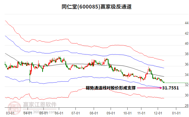 依據(jù)贏家江恩系統(tǒng)趨勢工具極反通道分析判斷同仁堂600085運(yùn)行在生命線以下弱勢區(qū)域,根據(jù)規(guī)則該股短線輕倉參與,股價(jià)跌至弱勢外軌線后波段再結(jié)合其它工具信號建倉。應(yīng)用口訣是:生命線上強(qiáng)勢走,生命線下難抬頭;紅黃兩條外軌線,壓力支撐顯勢頭。