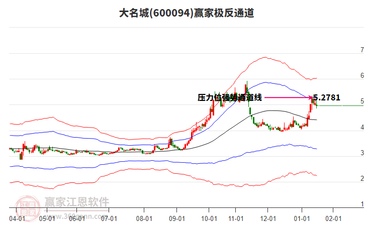1月19日600094大名城最高價(jià)5.43上穿了贏家極反通道工具藍(lán)色外軌線,受到藍(lán)色外軌線強(qiáng)力壓制,最終收盤(pán)停留在在藍(lán)色外軌線與生命線上方的強(qiáng)勢(shì)通道區(qū)域。600094大名城近10個(gè)交易日漲幅24.16