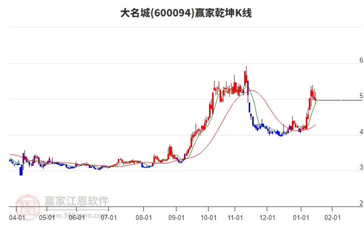 600094大名城最高價(jià)上穿藍(lán)色外軌線 漲幅4.43%
