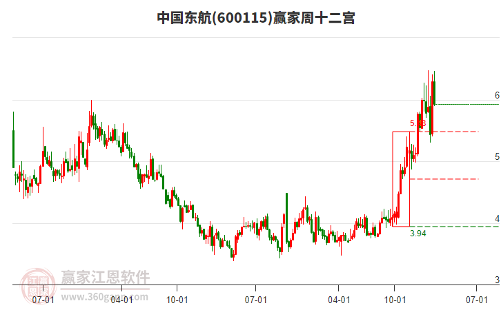 中國(guó)東航600115低開(kāi)收穿頭破腳中陽(yáng)線,突破江恩價(jià)格百分比工具壓力位5.94元