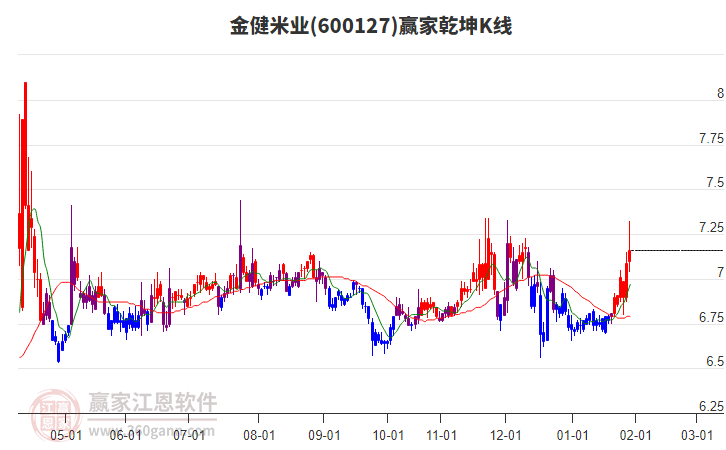 當(dāng)天金健米業(yè)600127上穿藍(lán)色外軌線 以光腳長(zhǎng)上影小陽(yáng)線收盤