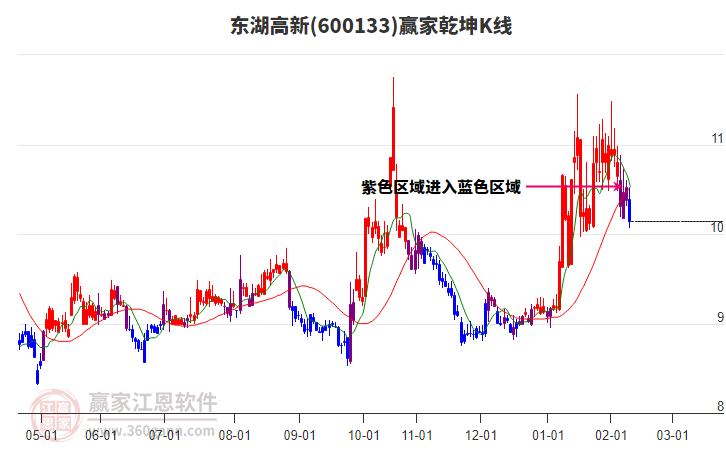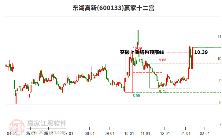 東湖高新600133低開收陽線,上穿贏家十二宮上漲結構頂部線
