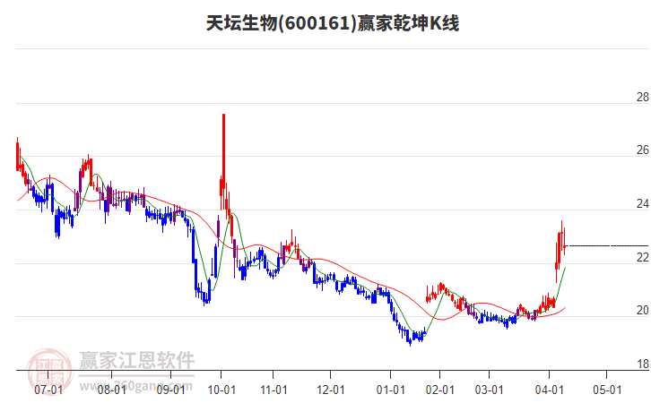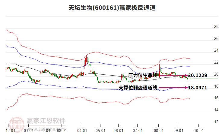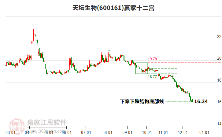600161天壇生物近期高點18.68持續(xù)下跌,漲幅回落15.45%,下穿贏家十二宮下跌結(jié)構(gòu)底部線