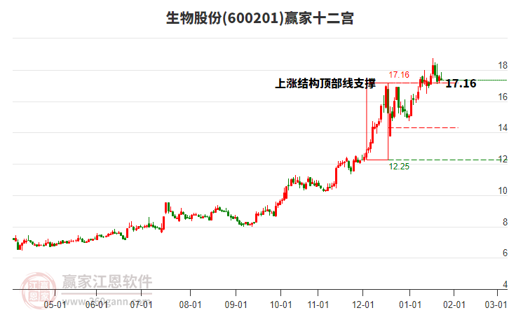 生物股份(600201)處于贏家江恩多頭主線形態(tài),12月25日發(fā)出江恩筑頂信號(hào)后,經(jīng)過(guò)11日,今日再次發(fā)出江恩底分型并發(fā)出江恩筑底信號(hào),中期雖然處于回調(diào)中,但長(zhǎng)期多頭趨勢(shì)延續(xù)。生物股份(600201)
