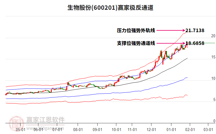 依據(jù)贏家江恩系統(tǒng)趨勢(shì)工具極反通道分析判斷生物股份600201運(yùn)行在生命線以下弱勢(shì)區(qū)域,根據(jù)規(guī)則該股短線輕倉(cāng)參與,股價(jià)跌至弱勢(shì)外軌線后波段再結(jié)合其它工具信號(hào)建倉(cāng)。應(yīng)用口訣是:生命線上強(qiáng)勢(shì)走,生命線下難抬頭;紅黃兩條外軌線,壓力支撐顯勢(shì)頭。