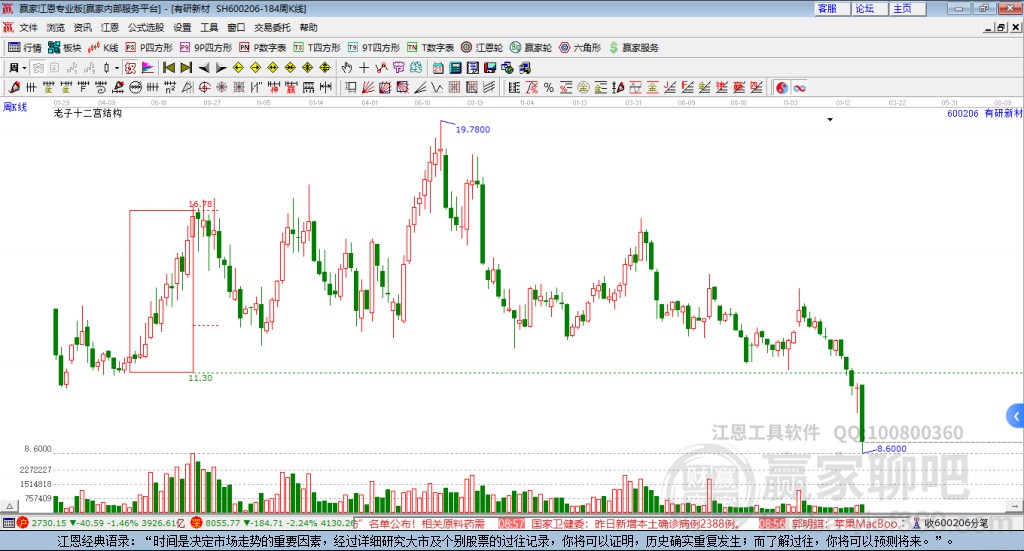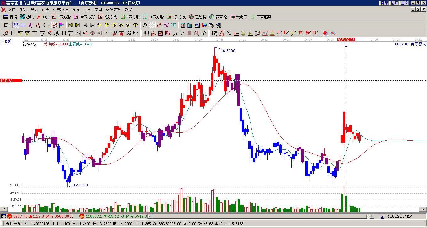 600206有研新材處于贏家江恩多頭中期回調形態(tài),從12月5日形成頂分型后持續(xù)下跌,重心下移,今日跌破前低形成短期初次筑頂信號,短期多頭趨勢已被破壞,中長期多頭趨勢依舊保持。600206有研新材根據(jù)贏
