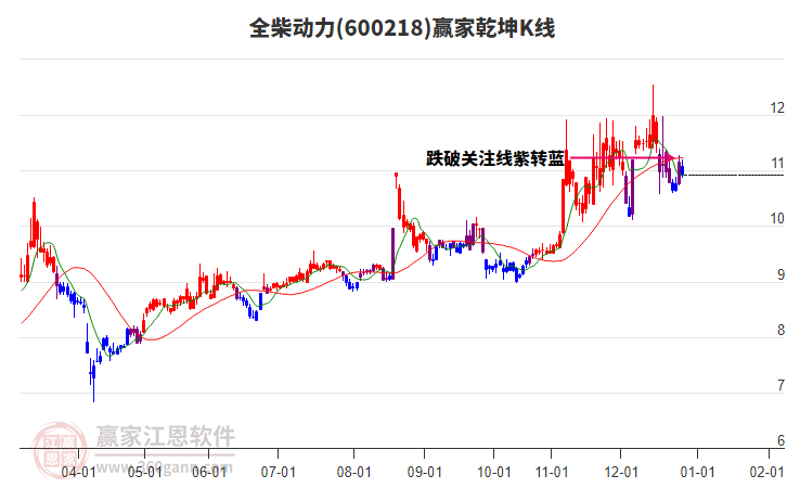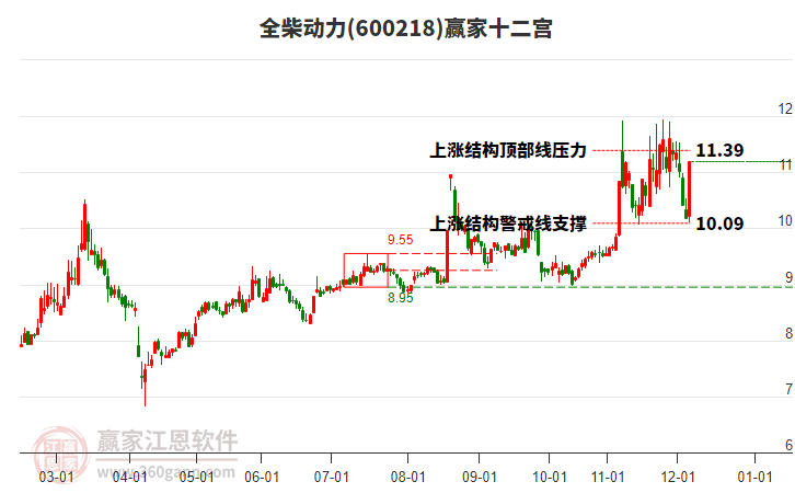當天全柴動力600218最高價12.56上穿了贏家極反通道工具藍色外軌線,受到藍色外軌線強力壓制,最終收盤停留在在藍色外軌線與生命線上方的強勢通道區(qū)域。全柴動力600218近10個交易日漲幅5.73%