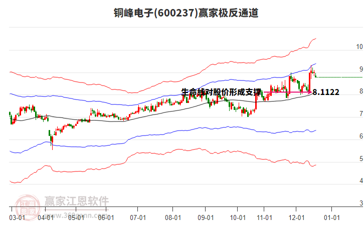 依據(jù)贏家江恩系統(tǒng)趨勢工具極反通道分析判斷銅峰電子600237運行在生命線以上強勢區(qū)域,根據(jù)規(guī)則該股可短線、波段結(jié)合操作;結(jié)合物極必反的原理通過分鐘圖做盤中差價,應(yīng)用口訣是:生命線上強勢走,生命線下難抬頭;紅黃兩條外軌線,壓力支撐顯勢頭。