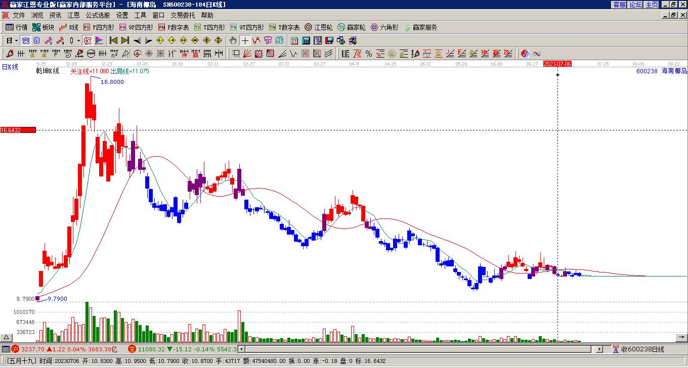 *ST椰島(600238)處于贏家江恩空頭主線形態(tài),今日重心持續(xù)下移,短期延續(xù)下跌趨勢(shì),7月8日發(fā)出中期江恩筑底信號(hào)后,經(jīng)過(guò)204日,今日形成中期筑頂信號(hào),注意風(fēng)險(xiǎn)規(guī)避。*ST椰島(600238)根據(jù)