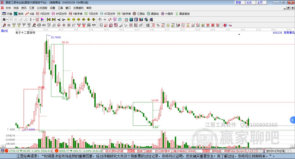 *ST椰島(600238)處于贏家江恩空頭主線形態(tài),今日重心下移,形成了頂分型,7月8日發(fā)出中期江恩筑底信號(hào)后,經(jīng)過(guò)143日,今日形成中期筑頂信號(hào),注意風(fēng)險(xiǎn)規(guī)避。*ST椰島(600238)根據(jù)贏家江恩