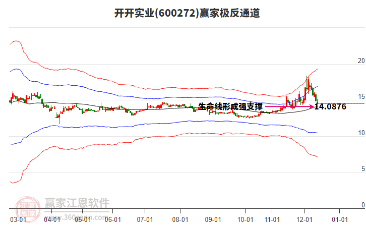 依據(jù)贏家江恩系統(tǒng)趨勢工具極反通道分析判斷開開實業(yè)600272運行在生命線以上強勢區(qū)域,根據(jù)規(guī)則該股可短線、波段結(jié)合操作;結(jié)合物極必反的原理通過分鐘圖做盤中差價,應(yīng)用口訣是:生命線上強勢走,生命線下難抬頭;紅黃兩條外軌線,壓力支撐顯勢頭。