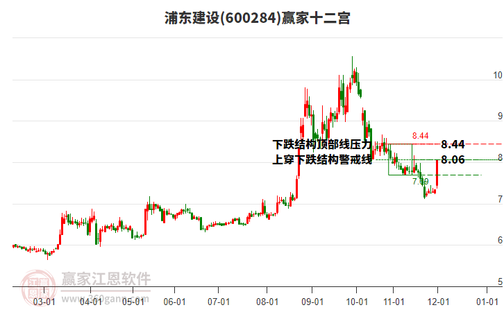 浦東建設(shè)600284低開收陽線,突破波段百分比工具壓力位8.42元