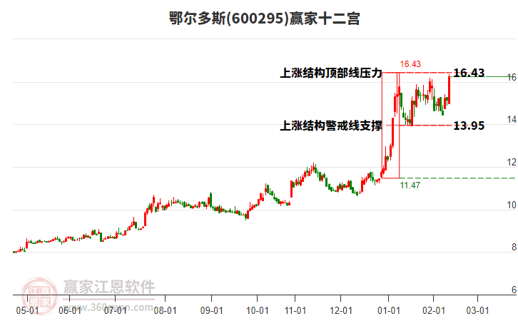 2月13日K線小幅下跌3.66%,目前受到25日前形成的上漲結(jié)構(gòu)頂部線16.43壓制,本輪自前方低點2月6日14.45元,上漲至今日已持續(xù)5日,多方能量得到釋放,空方能量逐漸增強。依據(jù)贏家十二宮結(jié)構(gòu)規(guī)則,股價若不能有效突破站穩(wěn)上漲結(jié)構(gòu)頂部線,多方能量逐漸衰竭,空方能量逐漸主導,向下方警戒線13.95位置附近尋找新的平衡位。若向上突破站穩(wěn)頂部線16.43,有望突破前期形成的高點。
