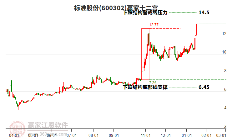 標(biāo)準(zhǔn)股份600302漲至老子十二宮上漲結(jié)構(gòu)頂部上方區(qū)域附近 近21個(gè)交易日漲幅41.6%