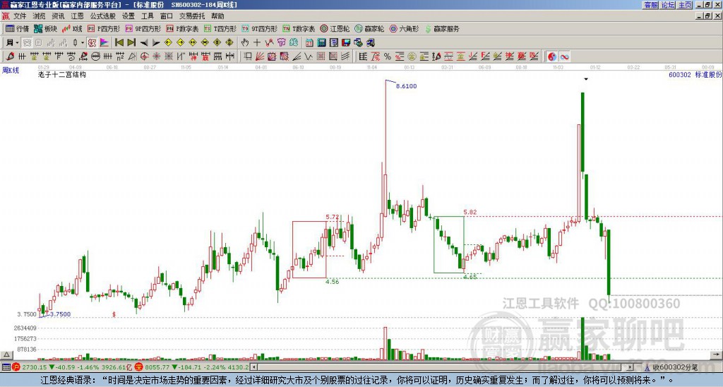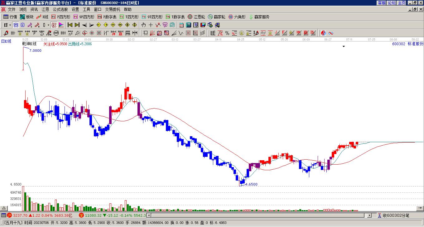 標(biāo)準(zhǔn)股份600302漲至老子十二宮下跌結(jié)構(gòu)頂部紅色阻力線上方區(qū)域附近 近19個(gè)交易日漲幅25.11%