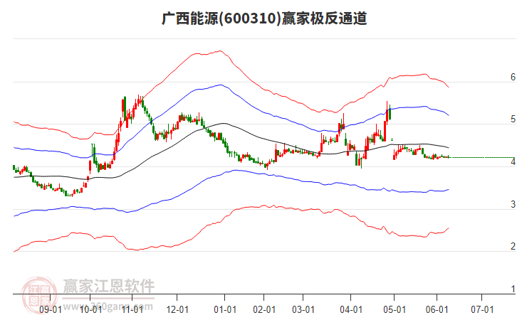 依據(jù)贏家江恩系統(tǒng)趨勢工具極反通道分析判斷廣西能源600310運行在生命線以下弱勢區(qū)域,根據(jù)規(guī)則該股短線輕倉參與,股價跌至弱勢外軌線后波段再結(jié)合其它工具信號建倉。應(yīng)用口訣是:生命線上強勢走,生命線下難抬頭;紅黃兩條外軌線,壓力支撐顯勢頭。