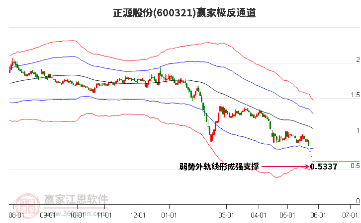 5月30日股價跌破弱勢外軌線,由超弱通道進入極弱區(qū)域,自前期高點5月17日跌至今日,共下跌0.49點,跌幅達98.0%,依據(jù)極反通道規(guī)則,大量歷史數(shù)據(jù)顯示市場絕大多數(shù)走勢都在極反通道5條線內(nèi),只有極少數(shù)會跌破弱勢外軌線進入超弱區(qū)域,注意基本面的變化。