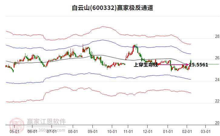 依據(jù)贏家江恩系統(tǒng)趨勢工具極反通道分析判斷白云山600332運行在生命線以下弱勢區(qū)域,根據(jù)規(guī)則該股短線輕倉參與,股價跌至弱勢外軌線后波段再結(jié)合其它工具信號建倉。應用口訣是:生命線上強勢走,生命線下難抬頭;紅黃兩條外軌線,壓力支撐顯勢頭。