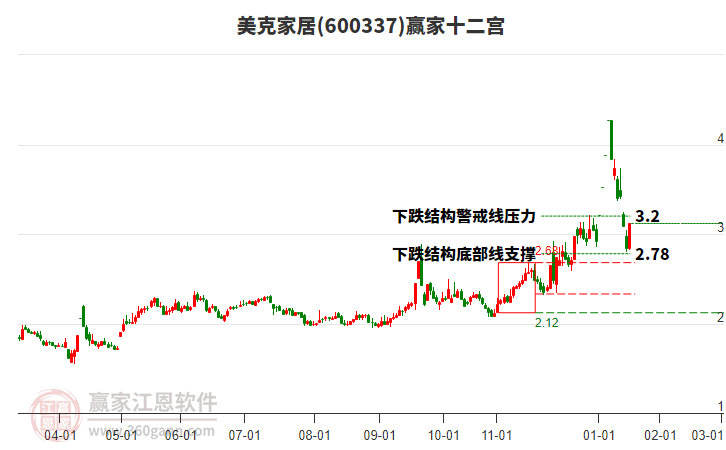 600337美克家居根據(jù)贏家江恩極反通道趨勢工具展示,上方壓力位3.5273,下方支撐位2.7539。600337美克家居處于贏家江恩多頭次主線形態(tài),從1月9日形成頂分型后持續(xù)下跌,重心下移,今日跌破