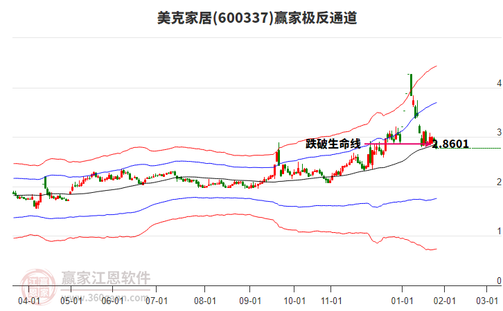 依據(jù)贏家江恩系統(tǒng)趨勢工具極反通道分析判斷美克家居600337運行在生命線以下弱勢區(qū)域,根據(jù)規(guī)則該股短線輕倉參與,股價跌至弱勢外軌線后波段再結合其它工具信號建倉。應用口訣是:生命線上強勢走,生命線下難抬頭;紅黃兩條外軌線,壓力支撐顯勢頭。