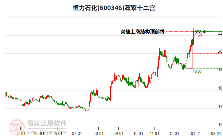 恒力石化(600346)處于贏家江恩多頭次主線形態(tài),12月22日發(fā)出江恩筑底信號(hào)后,經(jīng)過(guò)53日,今日形成短期筑頂信號(hào),短期多頭趨勢(shì)已被破壞,中長(zhǎng)期多頭趨勢(shì)依舊保持。恒力石化(600346)根據(jù)贏家江恩