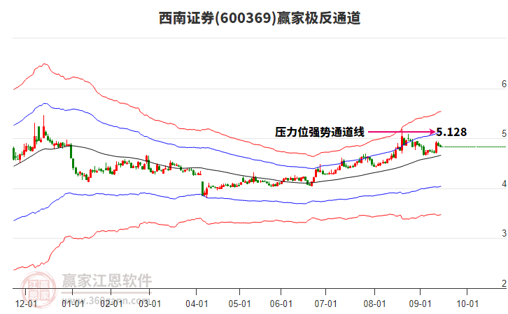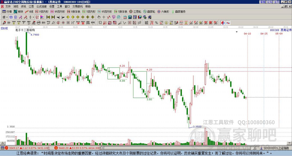 依據(jù)贏家江恩系統(tǒng)趨勢(shì)工具極反通道分析判斷西南證券600369運(yùn)行在生命線以下弱勢(shì)區(qū)域,根據(jù)規(guī)則該股短線輕倉(cāng)參與,股價(jià)跌至弱勢(shì)外軌線后波段再結(jié)合其它工具信號(hào)建倉(cāng)。應(yīng)用口訣是:生命線上強(qiáng)勢(shì)走,生命線下難抬頭;紅黃兩條外軌線,壓力支撐顯勢(shì)頭。