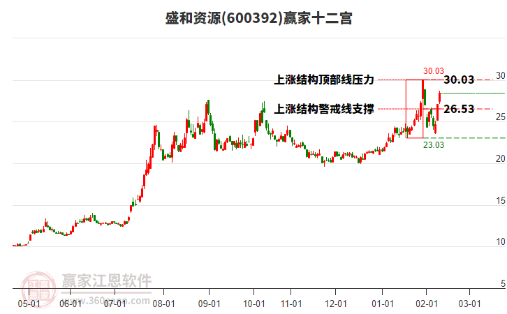 2月12日600392盛和資源最高價(jià)31.24上穿了贏家極反通道工具上方紅色外軌線,受到上方紅色外軌線強(qiáng)力壓制,最終收盤(pán)停留在在上方紅色外軌線與藍(lán)色外軌線上方的超強(qiáng)通道區(qū)域。600392盛和資源近10
