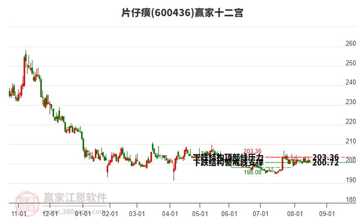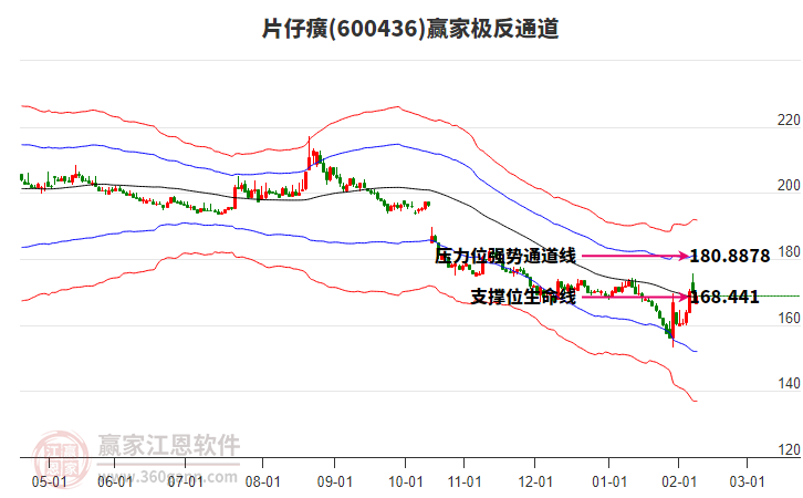 依據(jù)贏家江恩系統(tǒng)趨勢工具極反通道分析判斷片仔癀600436運行在生命線以下弱勢區(qū)域,根據(jù)規(guī)則該股短線輕倉參與,股價跌至弱勢外軌線后波段再結(jié)合其它工具信號建倉。應(yīng)用口訣是:生命線上強勢走,生命線下難抬頭;紅黃兩條外軌線,壓力支撐顯勢頭。
