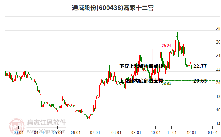 通威股份(600438)近期高點27.75持續(xù)下跌,漲幅回落24.16%,到達黃金價格回調(diào)支撐位工具支撐位22.07元上