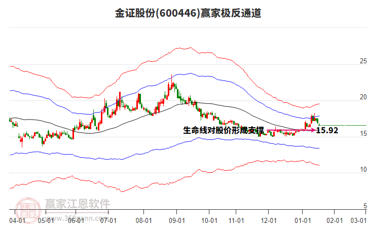 依據(jù)贏家江恩系統(tǒng)趨勢(shì)工具極反通道分析判斷金證股份600446運(yùn)行在生命線以下弱勢(shì)區(qū)域,根據(jù)規(guī)則該股短線輕倉(cāng)參與,股價(jià)跌至弱勢(shì)外軌線后波段再結(jié)合其它工具信號(hào)建倉(cāng)。應(yīng)用口訣是:生命線上強(qiáng)勢(shì)走,生命線下難抬頭;紅黃兩條外軌線,壓力支撐顯勢(shì)頭。