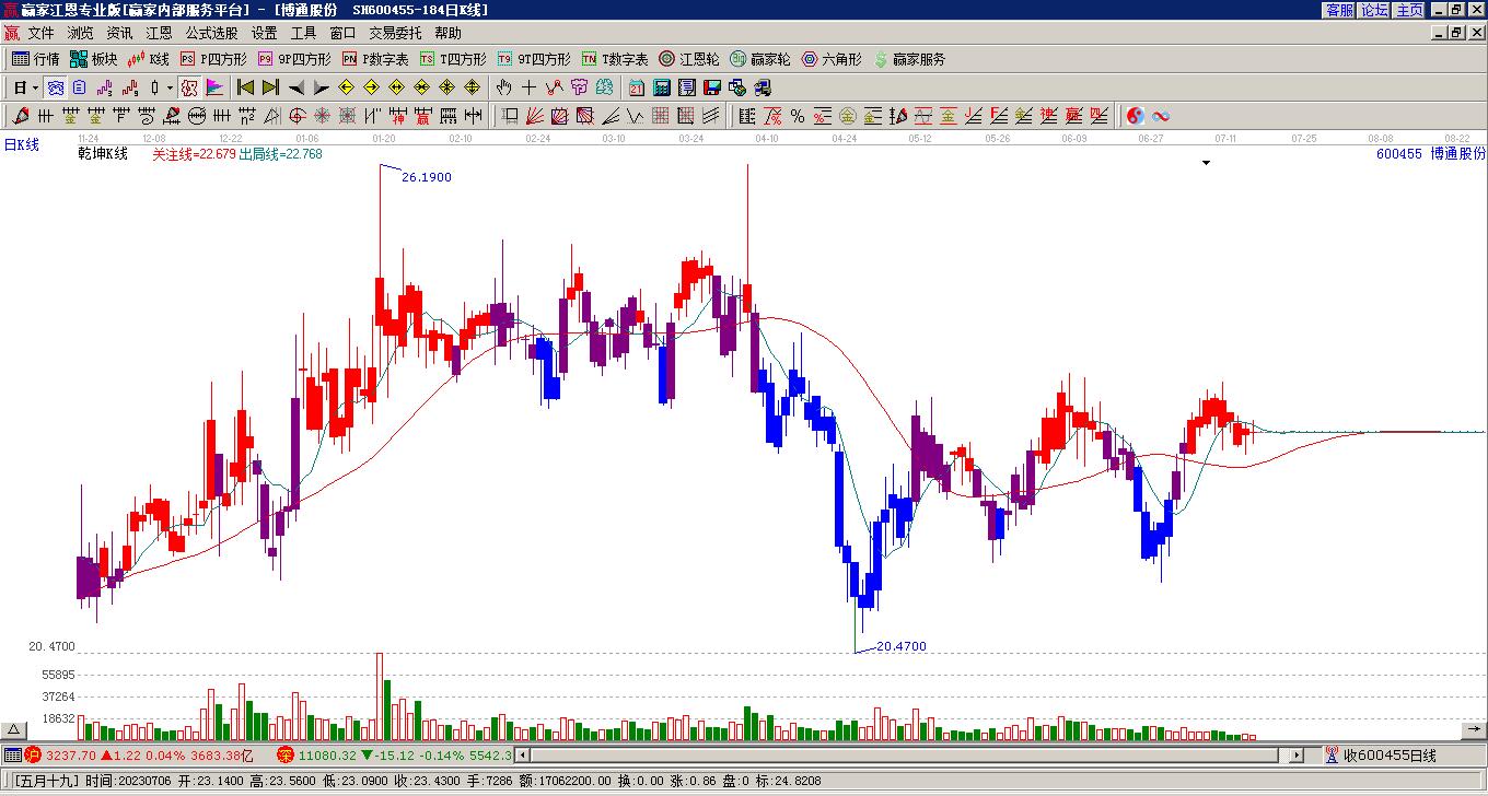 依據(jù)贏家江恩乾坤K線工具展示,本周K線以陰線收盤,目前K線處于紅色區(qū)域,位于關(guān)注線上方,依據(jù)贏家江恩乾坤K線多空模型,目前多頭出局線對(duì)當(dāng)前股價(jià)形成支撐,短期看多。后市如若股價(jià)跌破多頭出局線,則可能形成短期回調(diào)。
