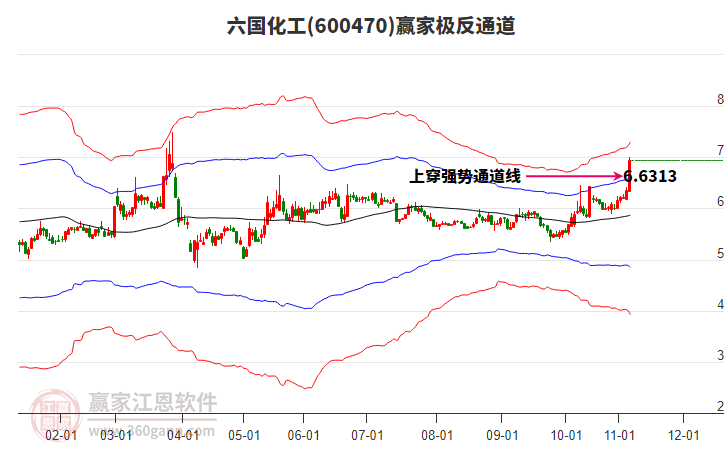 依據(jù)贏家江恩系統(tǒng)趨勢工具極反通道分析判斷六國化工600470運行在生命線以下弱勢區(qū)域,根據(jù)規(guī)則該股短線輕倉參與,股價跌至弱勢外軌線后波段再結(jié)合其它工具信號建倉。應用口訣是:生命線上強勢走,生命線下難抬頭;紅黃兩條外軌線,壓力支撐顯勢頭。
