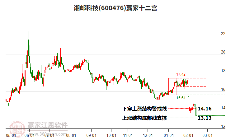 2月13日股價處在2025年1月21日形成的上漲結構底部線與警戒線之間,今日股價小幅上漲2.46%,目前處于底部線上方。依據(jù)贏家十二宮多空能量守恒規(guī)則,上漲結構底部線位置是多空能量轉(zhuǎn)換的一個關鍵位置。如底部線13.13支撐不破,由多方能量主導上攻,在警戒線14.16尋找多空能量平衡。如跌破底部線,空方動能占據(jù)主導,打開新的下跌空間。
