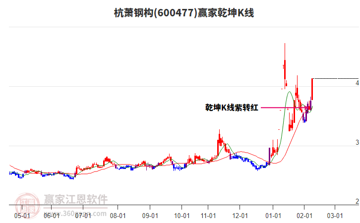 600477杭蕭鋼構(gòu)今日漲停,處于乾坤K線紅色上漲趨勢