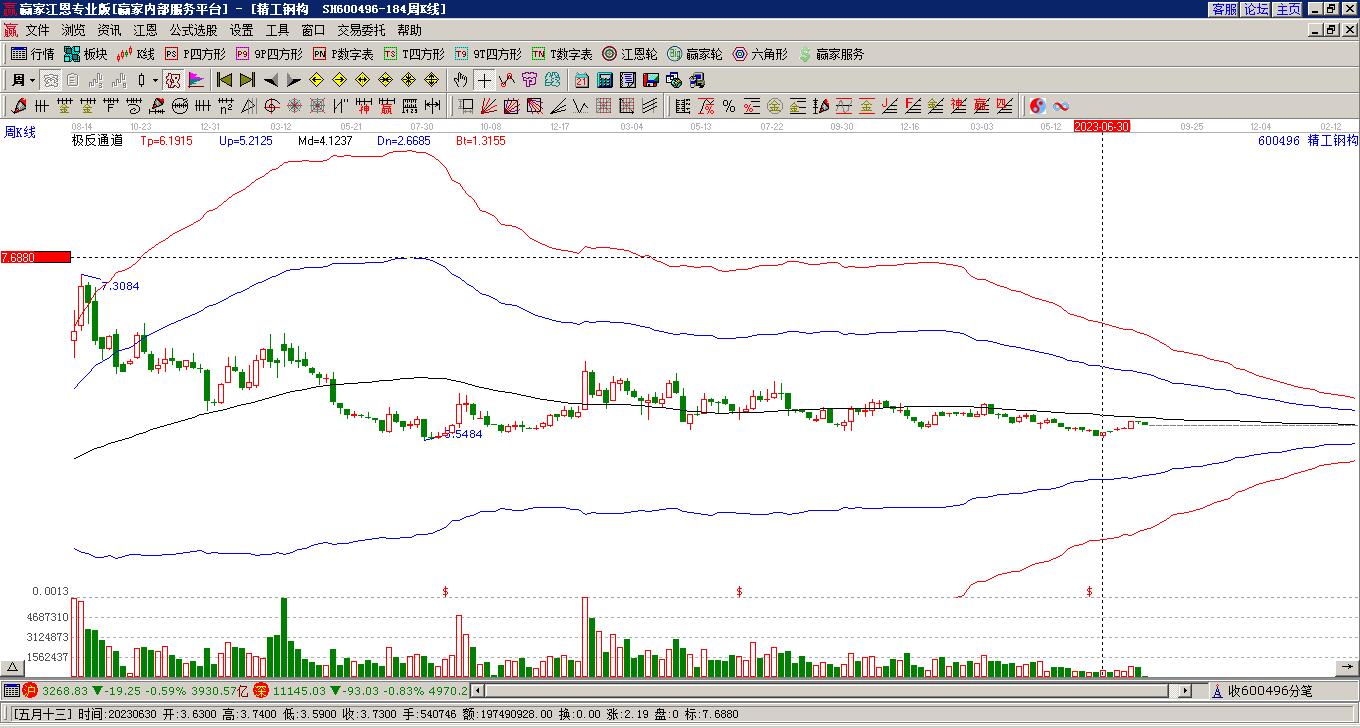 依據(jù)贏家江恩極反通道趨勢(shì)工具展示,本周收盤(pán)價(jià)4.47,跌破強(qiáng)勢(shì)通道線4.5938,短期走弱,極反通道規(guī)則顯示,失守一線,看低一線,下方支撐關(guān)注生命線3.5707,如延續(xù)下跌趨勢(shì),將向下尋找生命線支撐。