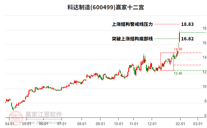 科達制造根據贏家江恩極反通道趨勢工具展示,上方壓力位14.9747,下方支撐位12.6465??七_制造處于贏家江恩多頭次主線形態(tài),12月8日發(fā)出江恩筑底信號后,經過7日,今日形成短期筑頂信號,短期多頭