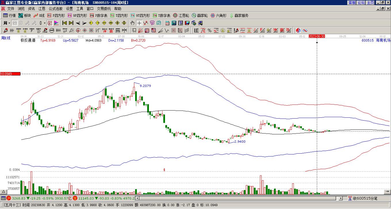 依據(jù)贏家江恩極反通道趨勢工具展示,本周股價處于生命線上強勢通道,本周收盤價4.54,自近期通道內(nèi)低點4.42上漲至本周,到達生命線4.0825點上方,短期關注此線支撐,如支撐不破,保持在強勢通道內(nèi),波段繼續(xù)看多,有望挑戰(zhàn)藍色上軌線。若跌破生命線4.0825,進入弱勢通道,調(diào)整周期繼續(xù)延長。