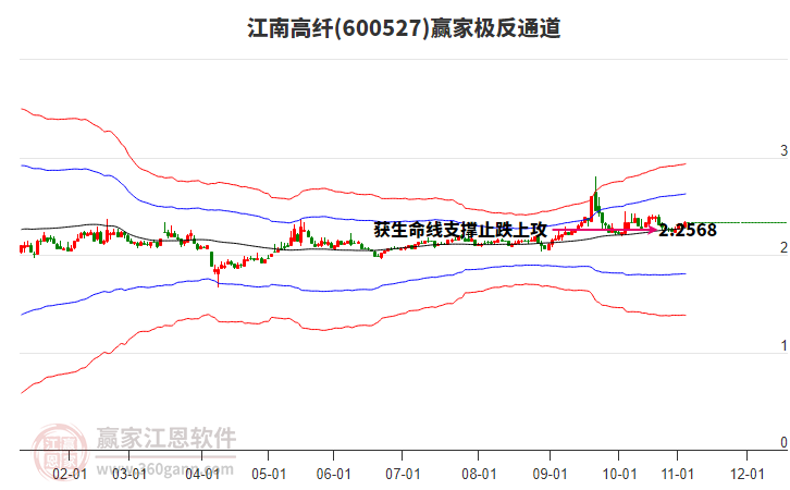依據(jù)贏家江恩系統(tǒng)趨勢工具極反通道分析判斷江南高纖600527運行在生命線以下弱勢區(qū)域,根據(jù)規(guī)則該股短線輕倉參與,股價跌至弱勢外軌線后波段再結(jié)合其它工具信號建倉。應(yīng)用口訣是:生命線上強勢走,生命線下難抬頭;紅黃兩條外軌線,壓力支撐顯勢頭。