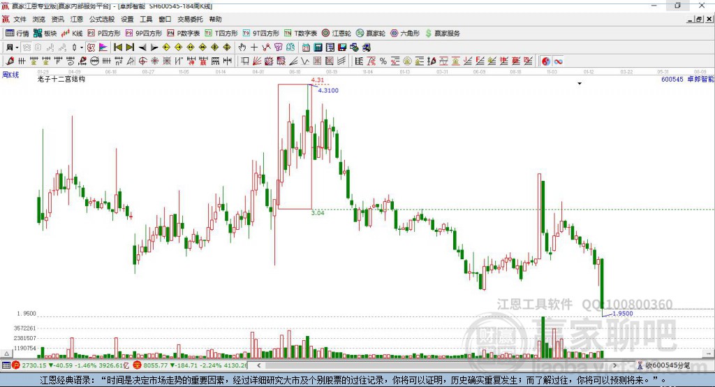 依據(jù)贏家江恩極反通道趨勢(shì)工具展示,該股于2月6日低點(diǎn)2.44,展開上攻,本周股價(jià)上穿生命線2.5856,由弱勢(shì)通道進(jìn)入強(qiáng)勢(shì)通道,依據(jù)贏家江恩極反通道規(guī)則,站穩(wěn)一線看高一線。若能有效站穩(wěn)生命線,則有望持續(xù)上攻至強(qiáng)勢(shì)通道線附近,若不能站穩(wěn)生命線,將繼續(xù)在弱勢(shì)通道運(yùn)行。