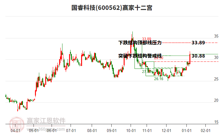 600562國睿科技根據(jù)贏家江恩極反通道趨勢工具展示,上方壓力位32.7966,下方支撐位28.3564。600562國??萍继幱谮A家江恩多頭中期回調(diào)形態(tài),10月30日發(fā)出江恩筑頂信號后,經(jīng)過46日,