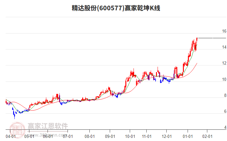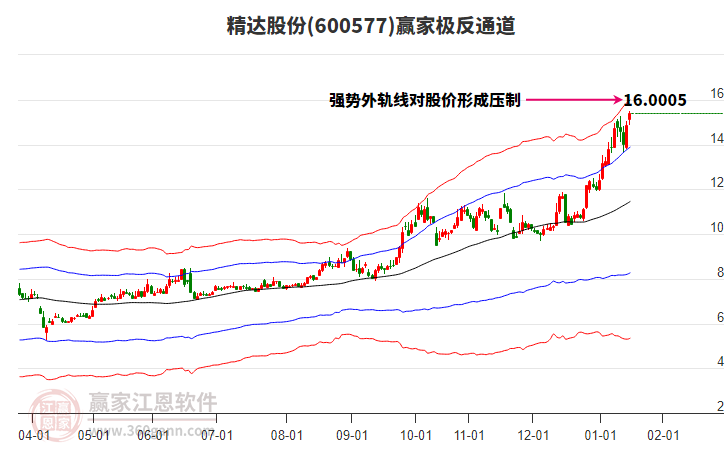 1月19日精達(dá)股份600577最高價(jià)16.41上穿了贏家極反通道工具上方紅色外軌線,受到上方紅色外軌線強(qiáng)力壓制,最終收盤停留在在上方紅色外軌線與藍(lán)色外軌線上方的超強(qiáng)通道區(qū)域。精達(dá)股份600577近10