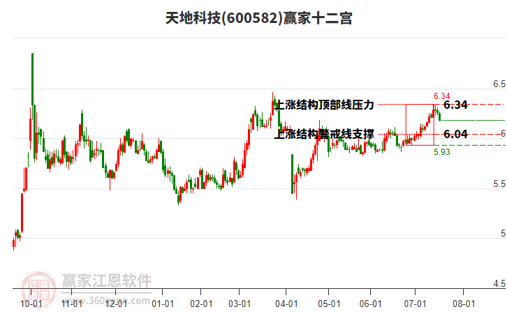 600582天地科技根據(jù)贏家江恩極反通道趨勢工具展示,上方壓力位5.9734,下方支撐位5.6047。600582天地科技處于贏家江恩空頭主線形態(tài),12月25日發(fā)出江恩筑底信號后,經(jīng)過5日,今日形成短