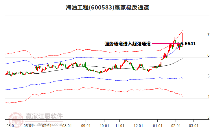 當天600583海油工程最高價6.65上穿了贏家極反通道工具上方紅色外軌線,受到上方紅色外軌線強力壓制,最終收盤停留在在上方紅色外軌線與藍色外軌線上方的超強通道區(qū)域。600583海油工程近10個交易日